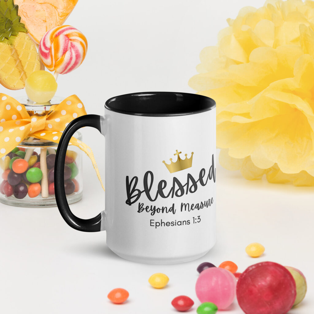 TLC Blessed Beyond Measure Eph 1:3 – Add a splash of color to your morning coffee or tea ritual! These ceramic mugs not only have a beautiful design on them, but also a colorful rim, handle, and inside, so the mug is bound to spice up your mug rack.